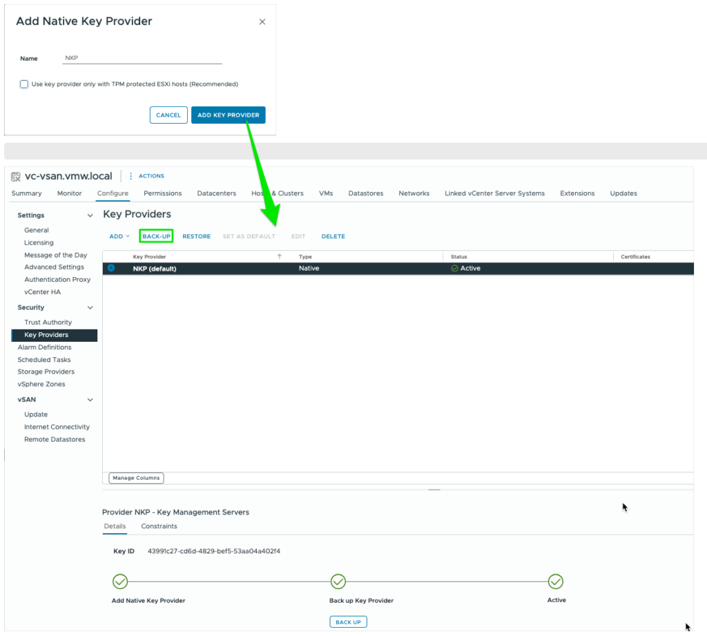 First, lets summarize what the NKP entails! This provider is included in vSphere since 2020 (7.0U2) and does not require an external key server (KMS). It enables vTPM for VM encryption and vSAN encryption and does not require a physical TPM2.0 installed on the ESXi-host. Backup of the NKP configuration is included in the file-based VCSA backup and manual NKP (p12) backup. The latter is required before the provider will be activated!