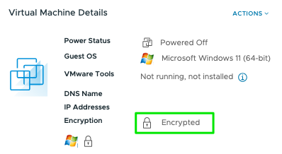 Directly after deleting the active and default NKP we see the VM keeps running without issue, but now it’s Encryption state converts to just “Encrypted”: